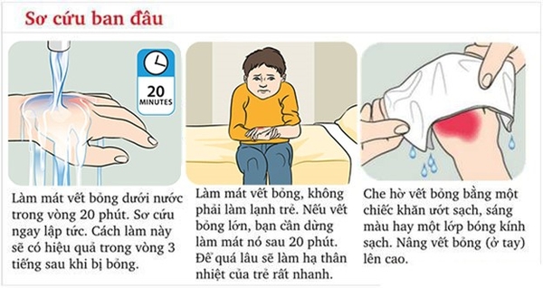 Chúng ta sẽ xử lý vết bỏng bằng nước sạch trong ít nhất 20 phút. Bố mẹ có thể dùng khăn thấm nước và đắp lên vết thương và liên tục thay khăn sau vài phút. Cố gắng thực hiện liên tục kể cả khi bé khóc la, chống đối.